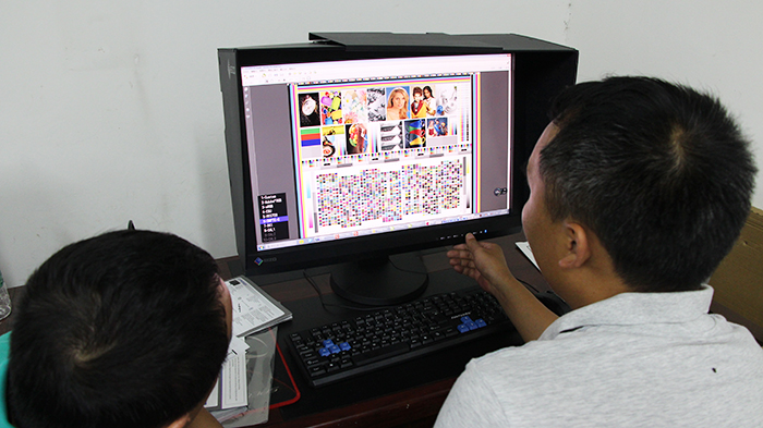 长沙印刷厂鑫成彩印总裁陈亮华正在与技术人员对色